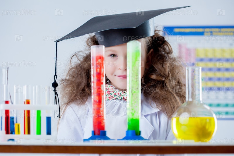 Маленькая девочка позирует в химической лаборатории