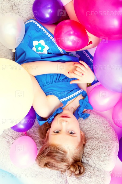 Маленькая девочка с шариками лежит на большом игрушечном медведе