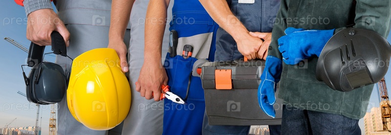 Мужчины со строительными инструментами и касками в руках