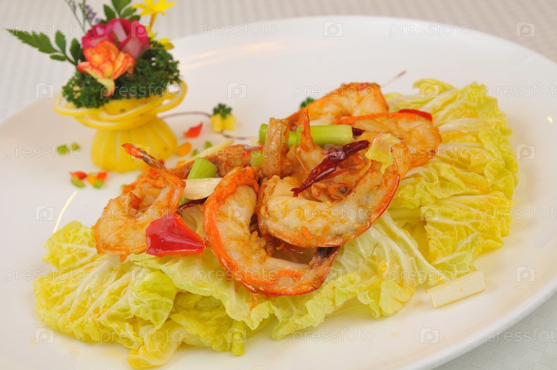 Тарелка жареных креветок макро