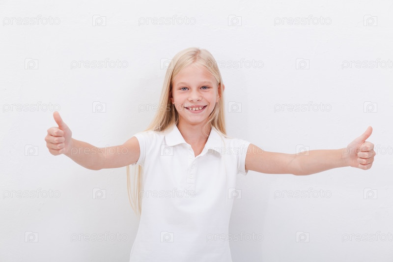 Красивая девочка показывает пальцы вверх