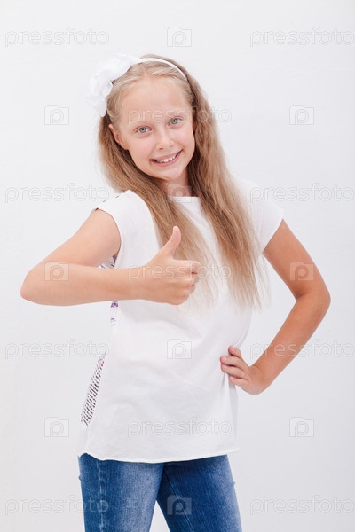 Красивая девочка показывает пальцы вверх