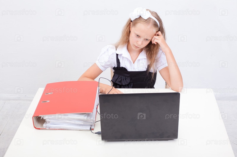 Задумчивая девочка за ноутбуком