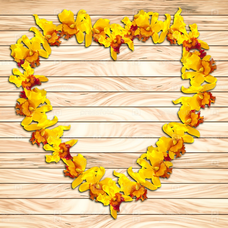 Рамка, желтые орхидеи сердца на фоне деревянной доски