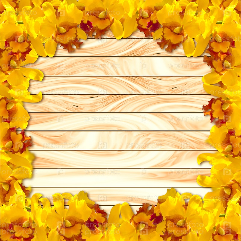 Рамка, желтые орхидеи на фоне деревянной доски