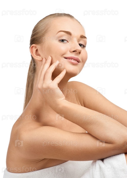 Красивая девушка в белом полотенце с длинными светлыми волосами