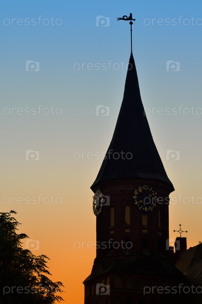 Башня Кафедрального собора Кенигсберга на фоне заката. Калининград, Россия