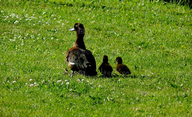 Утка с утятами на зеленой траве