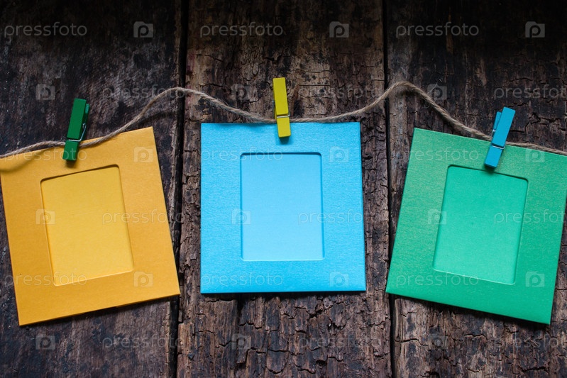 Фоторамки на веревке на фоне деревянные