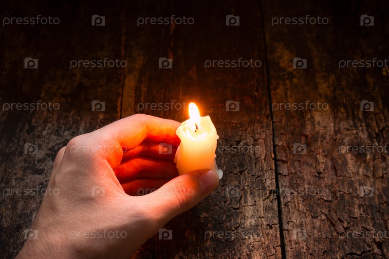 Человек, держащий в руках зажженные свечи на фоне деревянные