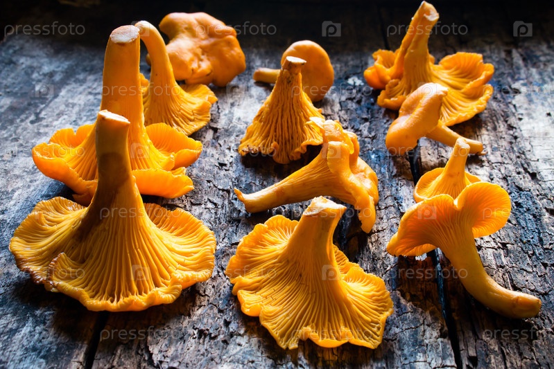 Крупным планом свежие лисички на деревянных фоне