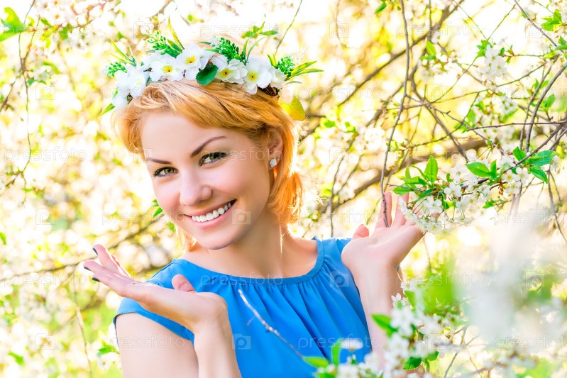 Счастливая девушка на фоне цветущего дерева