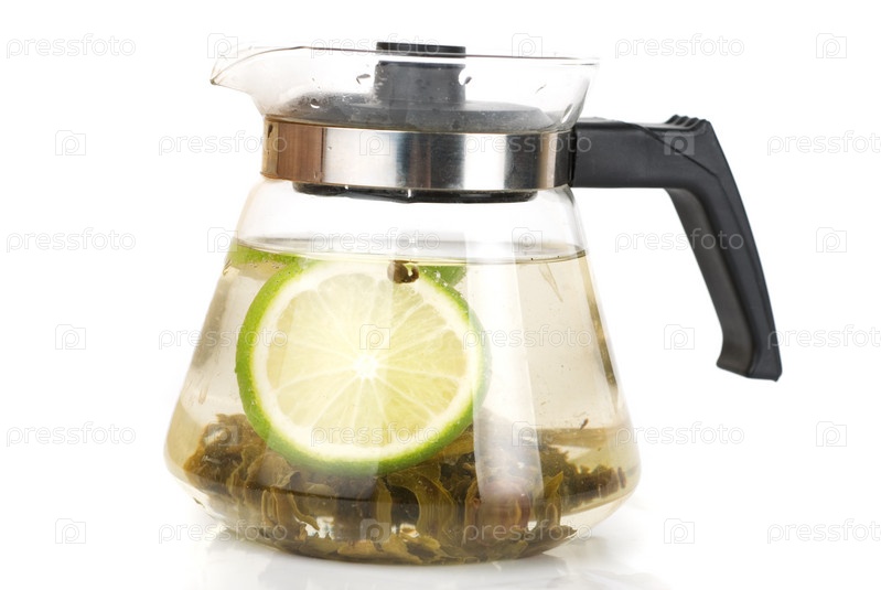 Чайник с зеленым чаем на белом фоне