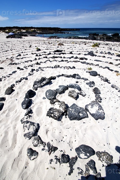 Белый песок с выложенными камнями в форме спирали