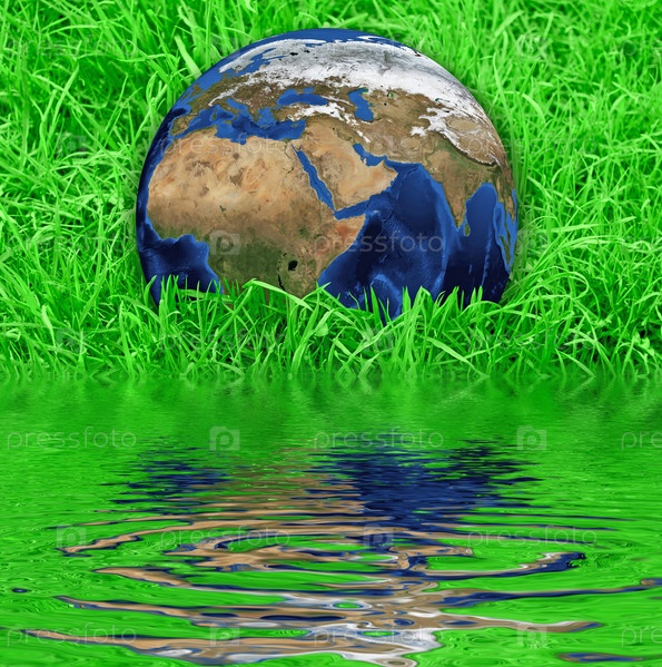 Планета Земля на зеленой траве возле берега