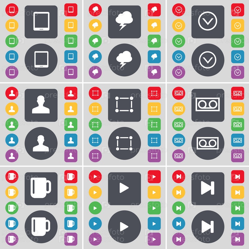 Планшетный ПК, молния, стрелка вниз, аватар, рамка, кассеты, Кубок, играть средства массовой информации, средства массовой информации показывать значок символа. Большой набор плоских, цветные кнопки для вашего дизайна. Вектор