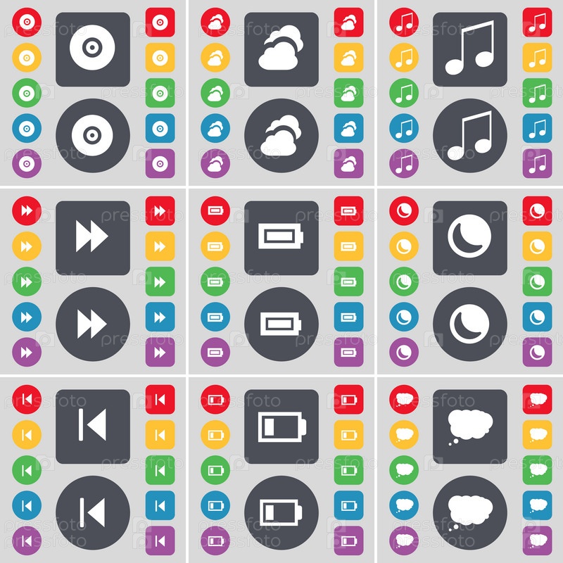 Диск, облако, примечание, перевернуть, батарея, луна, СМИ пропустить, чат облака значок символа. большой набор плоских цветных кнопок для вашего дизайна. вектор