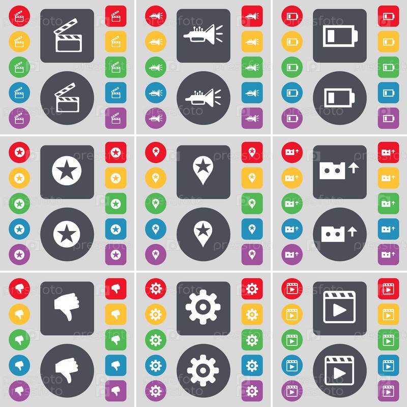 Клаппер, Trumped, батарея, звезда, контрольно-пропускной пункт, кассеты, вражда, оборудование, иконка символа медиаплеера. Большой набор плоских цветных кнопок для вашего дизайна. вектор