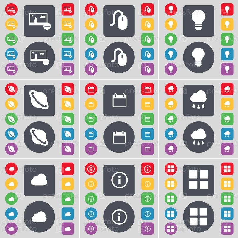 Фотография, мышь, лампочки, планета, календарь, облако, информация, символ значок приложения. Большой набор плоских, цветные кнопки для вашего дизайна. Вектор