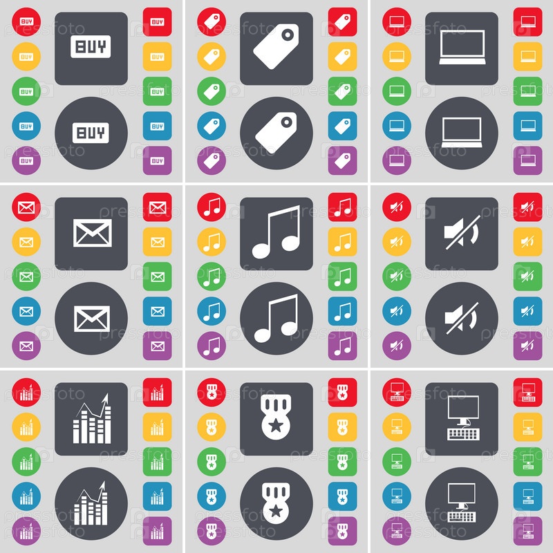 Купить, тег, ноутбук, сообщение, примечание, молчать, граф, медаль, символ значка ПК. большой набор плоских цветных кнопок для вашего дизайна. вектор