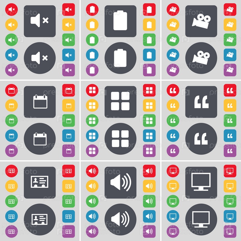 Тихий, батарейный, кинокамера, календарь, приложения, запятые, контакт, звук, монитор значок символа. большой набор плоских цветных кнопок для вашего дизайна. вектор