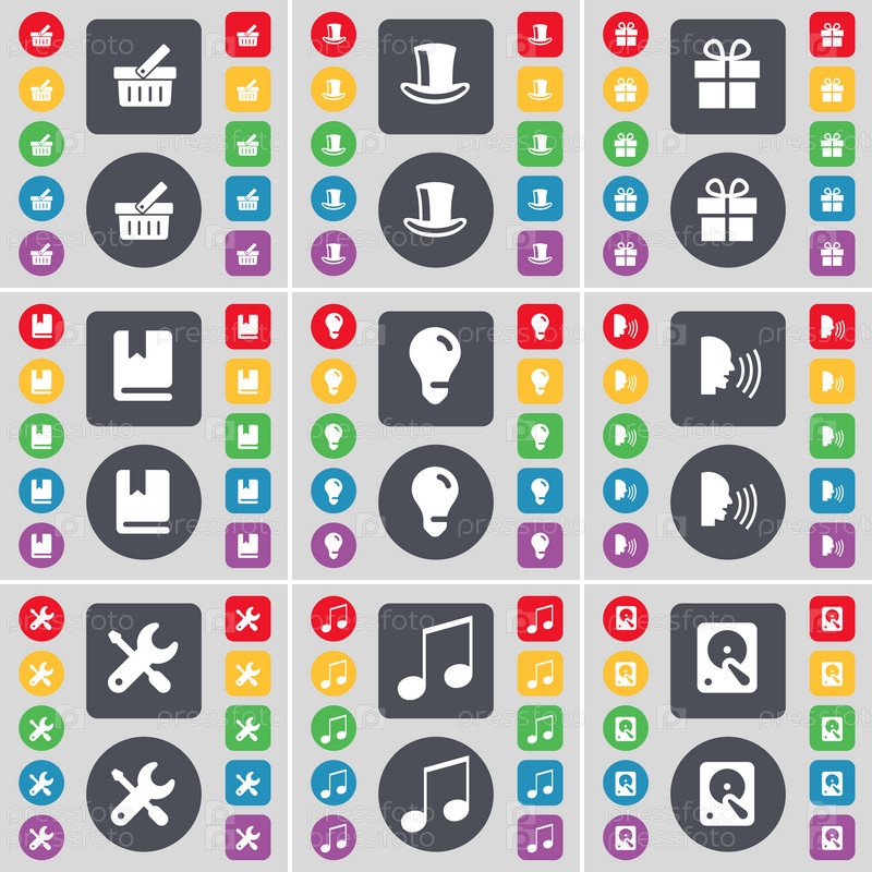 Корзина, шелковая шляпа, подарок, словарь, лампочки, разговор, гайковерт, примечание, символ иконка жесткого диска. большой набор плоских цветных кнопок для вашего дизайна. вектор
