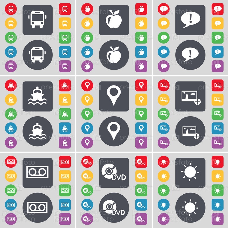 Автобус, приложения, чат-пузырь, корабль, контрольно-пропускной пункт, фотография, кассеты, DVD, легкий значок символа. Большой набор плоских цветных кнопок для вашего дизайна. вектор