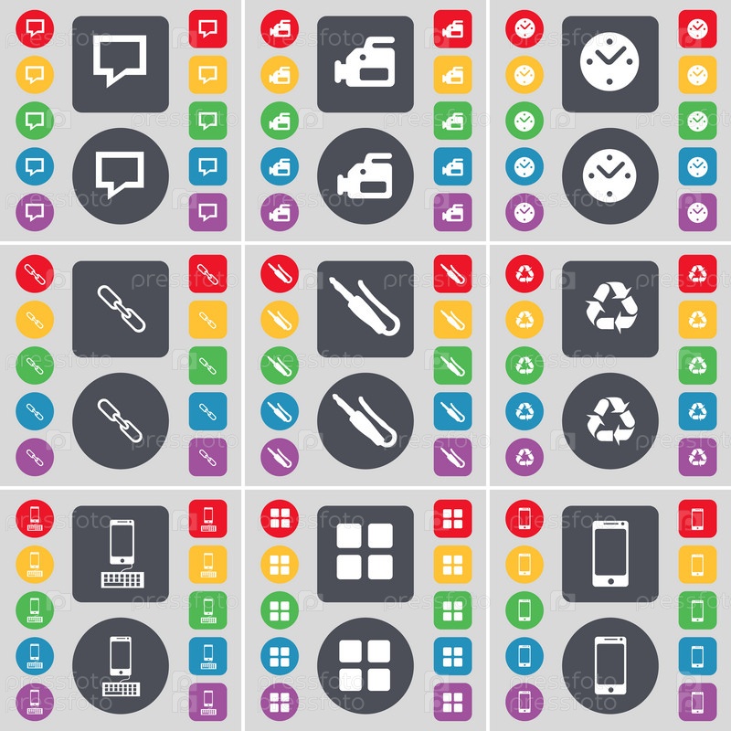 Чат пузырь, пленочной камеры, часы, ссылка, разъем для микрофона, переработка, смартфон, символ значок приложения. Большой набор плоских, цветные кнопки для вашего дизайна. Вектор