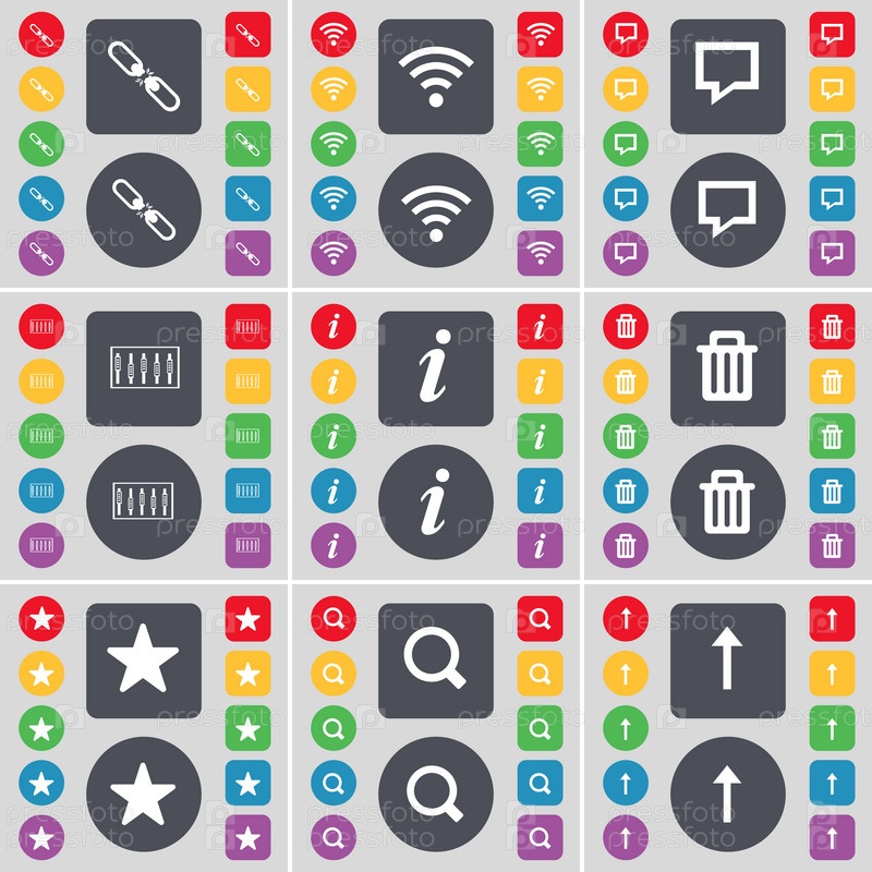 Связь, Wi-Fi, чат пузырь, эквалайзер, информация, мусор может звезды, увеличитель, стрелка вверх значок символа. большой набор плоских цветных кнопок для вашего дизайна. вектор