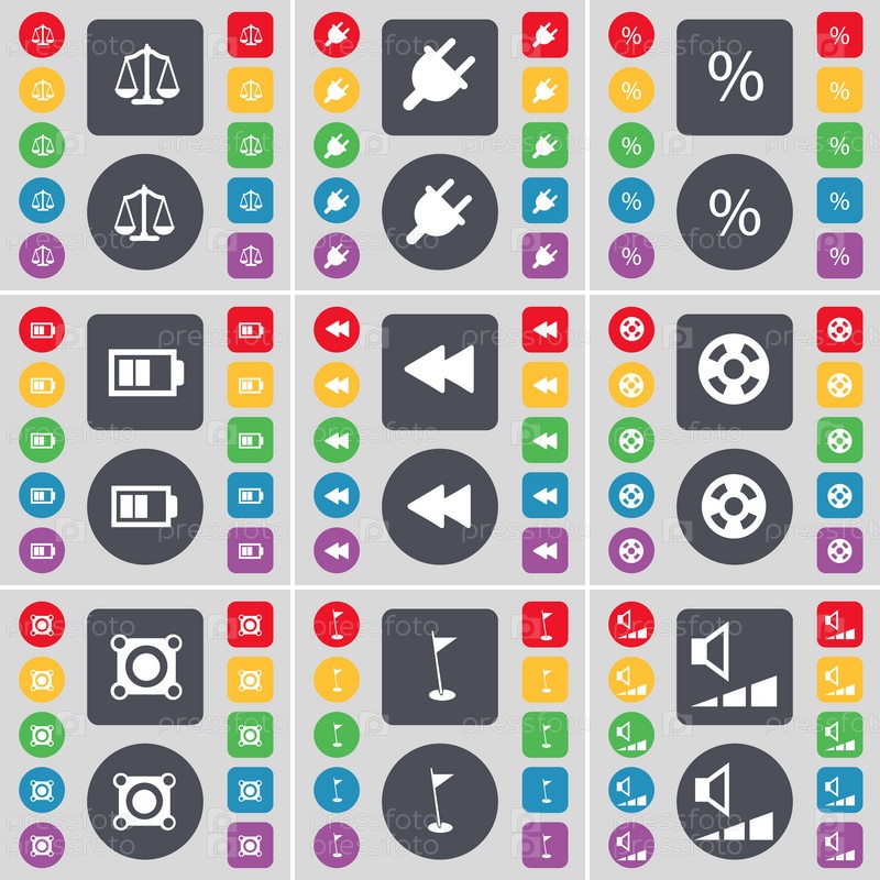 Весы, гнездо, проценты, батарея, Rewind, видеозапись, динамик, гольф-дверь, иконка символа объема. большой набор плоских цветных кнопок для вашего дизайна. вектор