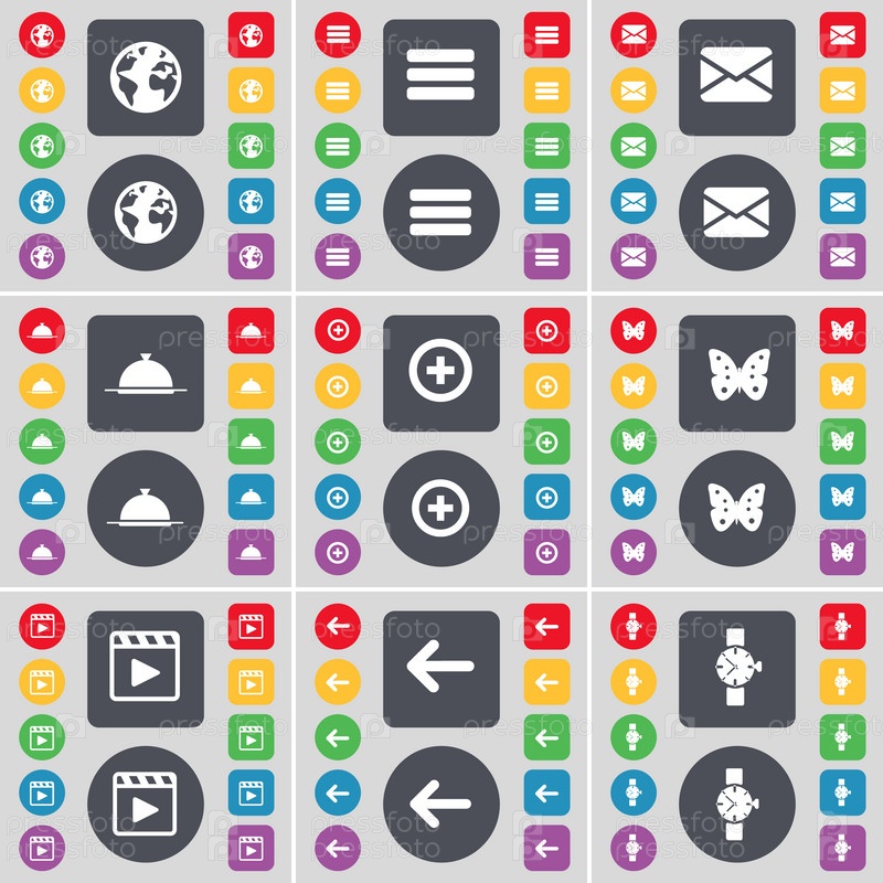 Земля, приложения, сообщение, лоток, плюс, маслянистый, Media player, стрелка слева, значок символа наручных часов. Большой набор плоских цветных кнопок для вашего дизайна. вектор