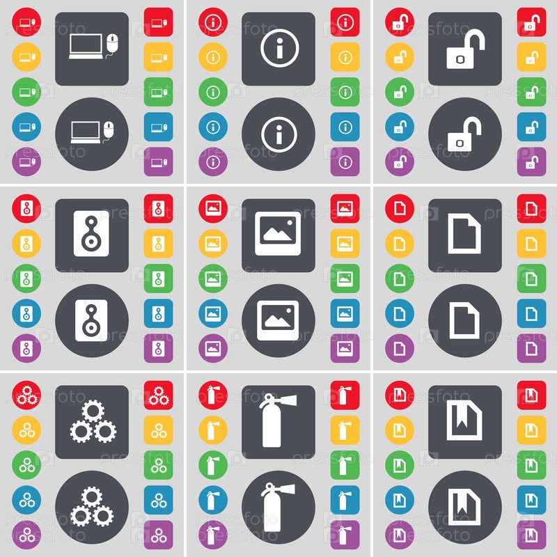 Ноутбук, информация, замок, спикер, окна, файл, снаряжение, Огнетушитель значок символа. Большой набор плоских, цветные кнопки для вашего дизайна. Вектор