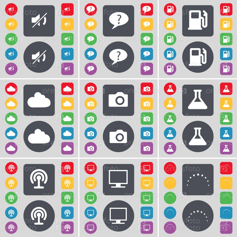 Немой, пузырь чата, заправочная станция, облако, камера, флаг, Wi-Fi, монитор, звезда иконка символа. большой набор плоских цветных кнопок для вашего дизайна. вектор