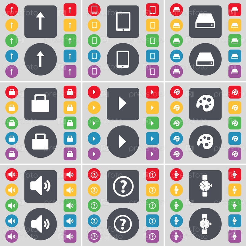 Стрелка вверх, Таблетный ПК, жесткий диск, замок, воспроизведение медиафайлов, палитра, звук, вопросительный знак, иконка символа наручных часов. Большой набор плоских цветных кнопок для вашего дизайна. вектор