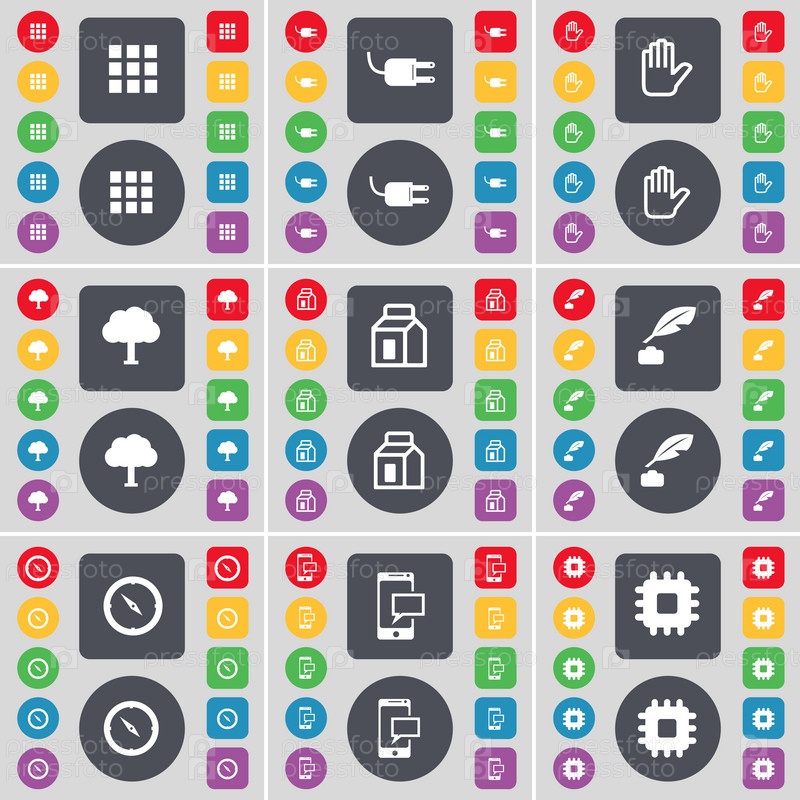 приложения, сокет, рука, дерево, упаковка, чернила, компас, SMS, процессор значок символа. большой набор плоских цветных кнопок для вашего дизайна. вектор