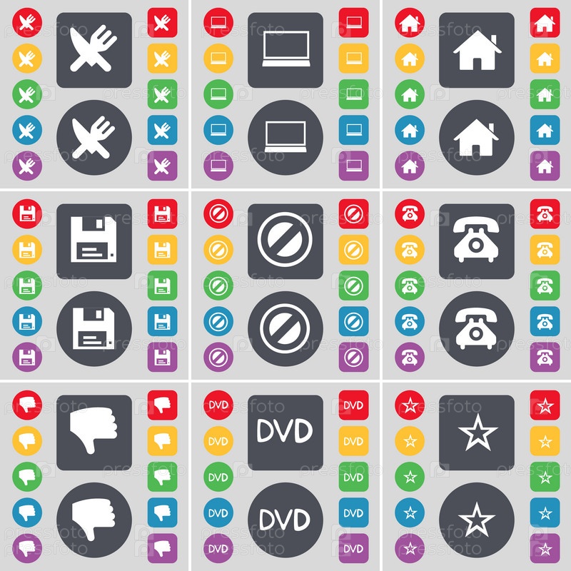 Вилка и нож, ноутбук, дом, флапи, стоп, ретро-телефон, вражда, DVD, символ значка звезды. большой набор плоских цветных кнопок для вашего дизайна. вектор
