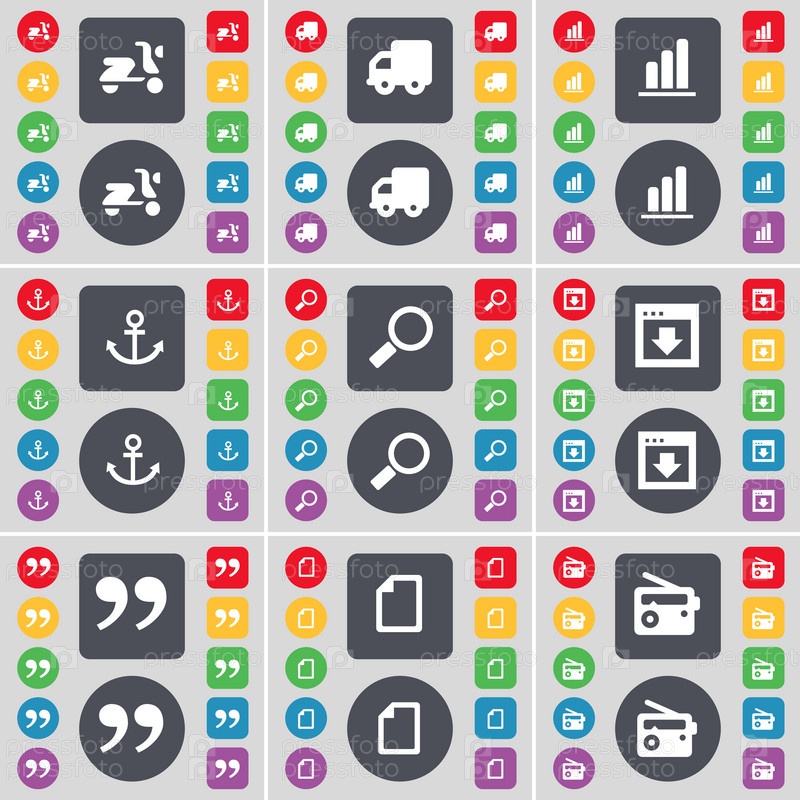 Скутер, грузовик, диаграмма, якорь, увеличительное стекло, окна, цитаты марка, файл, Радио значок символа. Большой набор плоских, цветные кнопки для вашего дизайна. Вектор