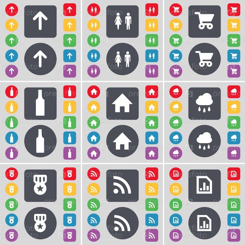 Стрелка вверх, силуэт, корзина, бутылка, дом, облако, медаль, RSS, схемы файлов иконки символа Большой набор плоских цветных кнопок для вашего дизайна. вектор