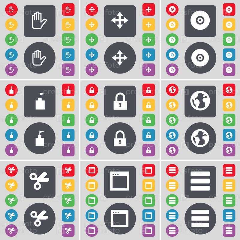 Стороны, перемещение, диск, флаг башня, замок, земля, ножницы, окно, символ значок приложения. Большой набор плоских, цветные кнопки для вашего дизайна. Вектор