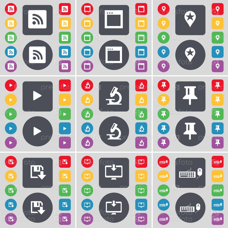 RSS, окна, контрольно-пропускная точка, воспроизведение СМИ, микроскоп, пин, флоппи, монитор, иконка символа клавиатуры. Большой набор плоских цветных кнопок для вашего дизайна. вектор