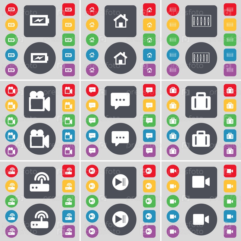 Зарядка, дом, эквалайзер, пленочной камеры, чат пузырь, чемодан, маршрутизатор, пропустить СМИ, фильм камеры значок символа. Большой набор плоских, цветные кнопки для вашего дизайна. Вектор