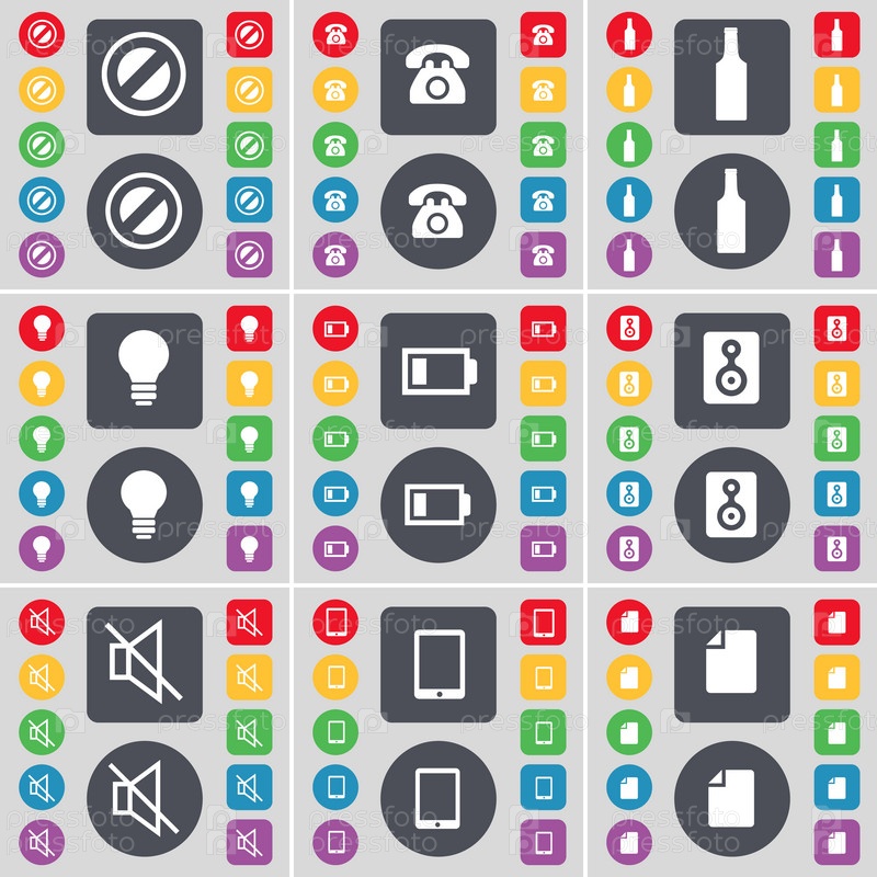 Стоп, ретро телефон, бутылка, лампочки, батарея, динамик, Mute, Tablet PC, символ значка файла. большой набор плоских цветных кнопок для вашего дизайна. вектор