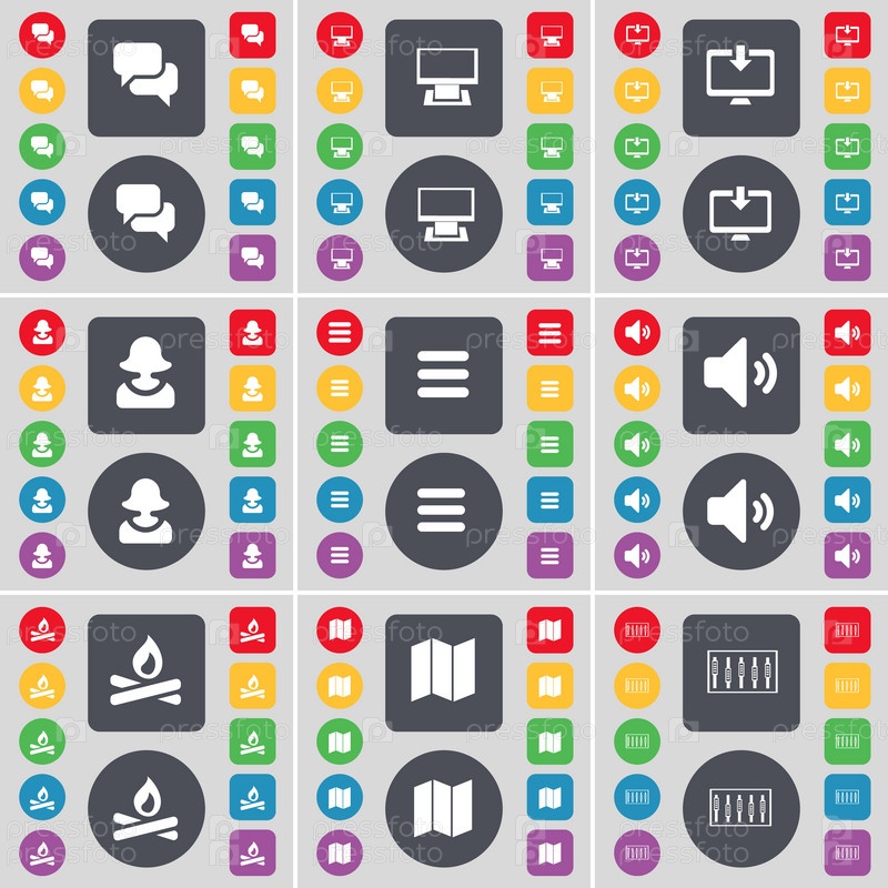 Чат, монитор, аватар, приложения, звук, огонь, карта, эквалайзер иконка символа. большой набор плоских цветных кнопок для вашего дизайна. вектор