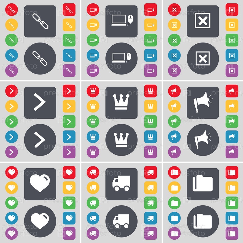 Ссылка, ноутбук, стоп, стрелка вверх, Корона, Мегафон, сердце, грузовик, символ значок папки. Большой набор плоских, цветные кнопки для вашего дизайна. Вектор