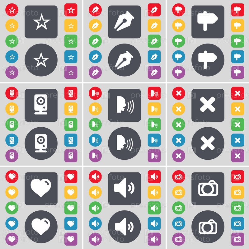 Звезда, перо чернил, указатель, спикер, разговор, остановка, сердце, звук, символ иконки камеры. большой набор плоских цветных кнопок для вашего дизайна. вектор
