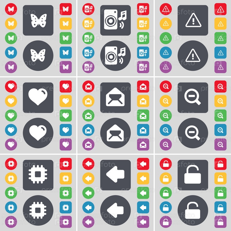 Бабочка, спикер, предупреждение, сердце, сообщение, увеличительное стекло, процессор, стрелка влево, символ значок замка. Большой набор плоских, цветные кнопки для вашего дизайна. Вектор