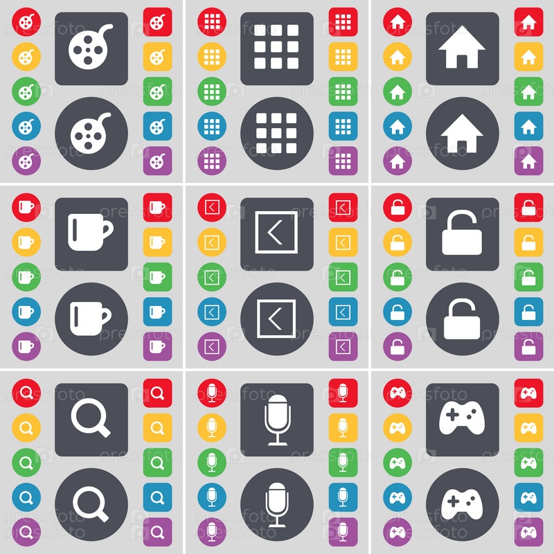 Видеозапись, Приложения, Дом, Кубок, стрелка влево, замок, лупа, микрофон, иконка символа GamePad. Большой набор плоских цветных кнопок для вашего дизайна. вектор