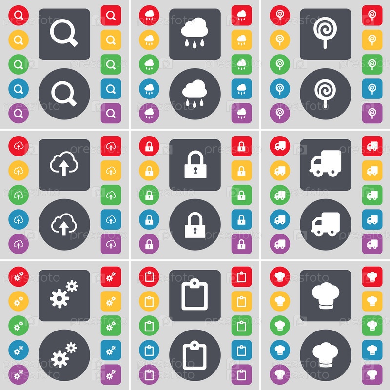 Увеличительное стекло, облако, леденец, облако, замок, грузовик, снаряжение, обследования, приготовление шляпу значок символа. Большой набор плоских, цветные кнопки для вашего дизайна. Вектор