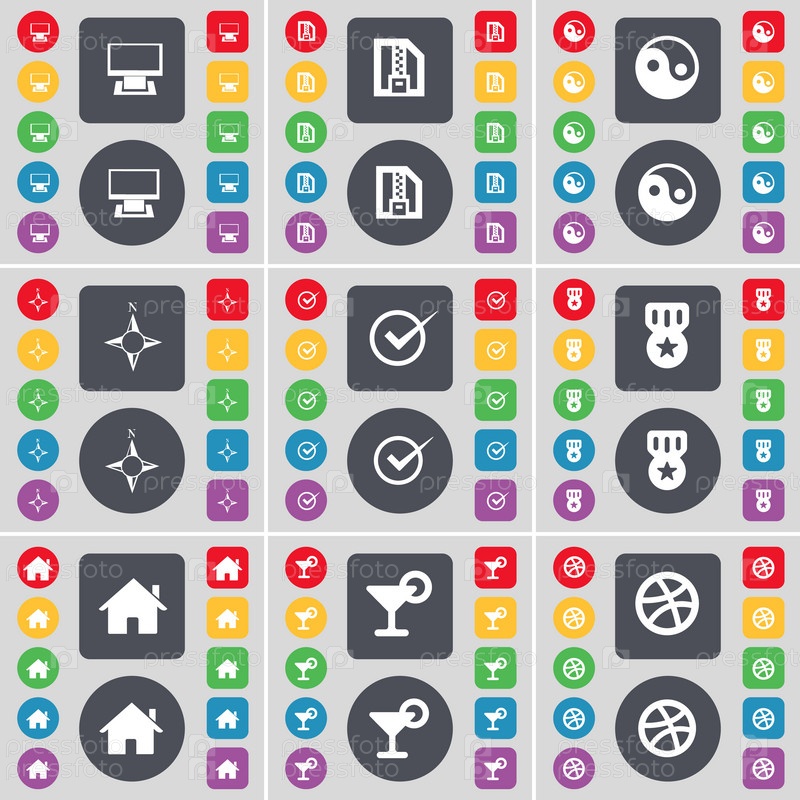 Монитор, ZIP-файл, Инь-Ян, компас, тик, медальон, дом, коктейль, иконка символа мяча. Большой набор плоских цветных кнопок для вашего дизайна