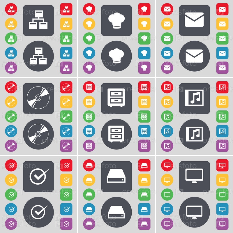 Сети, приготовление шляпа, сообщение, диск, тумбочка, музыка окна, тик, жесткий диск, монитор значок символа. Большой набор плоских, цветные кнопки для вашего дизайна. Вектор